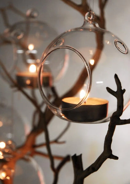 Delicately illuminate the branches of a tree with this set of 6 hanging glass tea light holders. Each glass orb is 3in wide with 1-3/4in opening. The bottom is flat to accommodate a tea light or Fairy Berries. For daytime use, fill with a flower or berries.