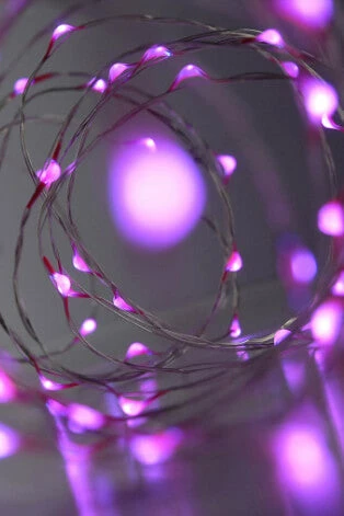 Battery operated fairy lights in pink on silver wire. Create that fairy light look with these extraordinarily beautiful Fantasia Fairy Light strings! The 20 LED Fairy Fantasia Lights are battery operated with very tiny and brilliant LEDs on extra small diameter wire that has been silver plated in a special process. The LEDs are about the size of a grain of rice and are spaced 2in apart. The silver wire adds to the ambiance and light reflection. These Fantasia Fairy Light string can be submerged in water from the silver wire on. A battery holder is included. The wire measures 40in and connects to a battery pack on a 10ft lead cord.