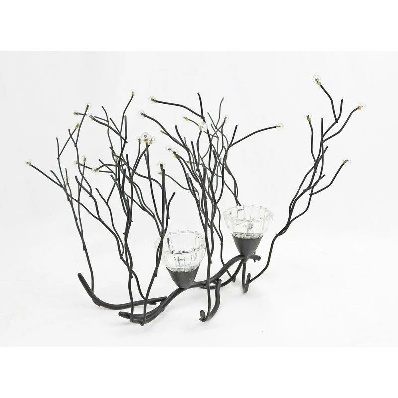 This Twig Tealight Candle Holder Metal is perfect for a dining room or coffee table centerpiece. This metal holder comes with 2 glass holders to accommodate 2 tealight candles; and is adorned with acrylic bead accents. The measurements and appearance can be varied as the twigs are fully bendable. Easy presentation – effective result! This piece is 8” wide at the base and up to 10” tall for the tallest twigs.