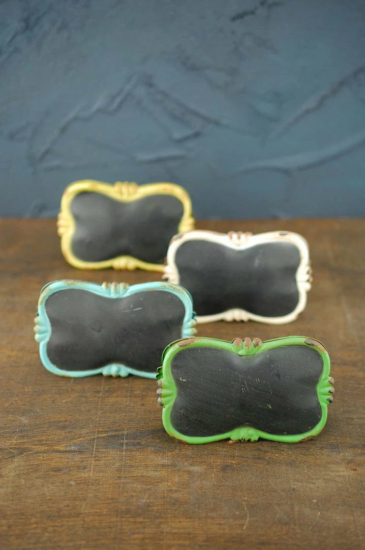 This set of 12 Metal Clips is the perfect addition to vintage-inspired décor and collections! Use these adorable clips at your special event for creative table numbering, buffet or candy bar displays; or add to your craft room supplies for easy labeling and organization! These charming metal clips are two-sided; and feature an elegant detailed edging around the writable chalkboard area (chalkboard markers not included). The frame detail is distressed for added vintage character. This set of a dozen clips includes different colors – Yellow, White, Blue, and Green (4 of each color).Â