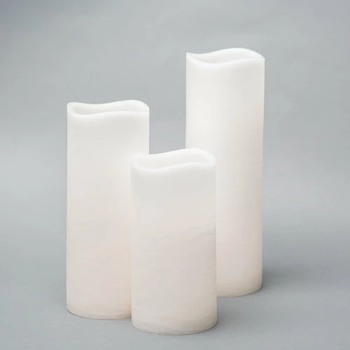A fabulous new look to our tried and true LED pillar candles! The wavy top adds to the character of these fabulous flameless candles. These beautiful candles provide hours upon hours of hassle-free simulated candle glow. With the textured outer wax shell and flickering amber-colored LED flame, these candles are perfect for home or event! With tiered sizes that add dimension to your table and no risk of mess, these 4″ wide LED candles are a great option for no-flame venues!