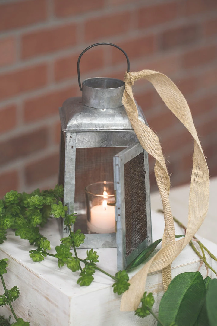 Fashion a rustic centerpiece out of this Galvanized Metal lantern. Place a votive candle inside this cage and surround it with shells, driftwood, or fall leaves. Use it as a unique centerpiece, or fill several of these containers with candles and place them throughout your event for soft light. Measures 8″ tall (10″ including the handle), the bottom is 4.5″ square, and the top is 4-3/8″ square.