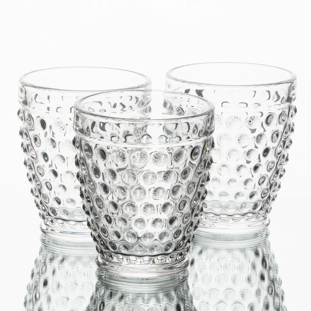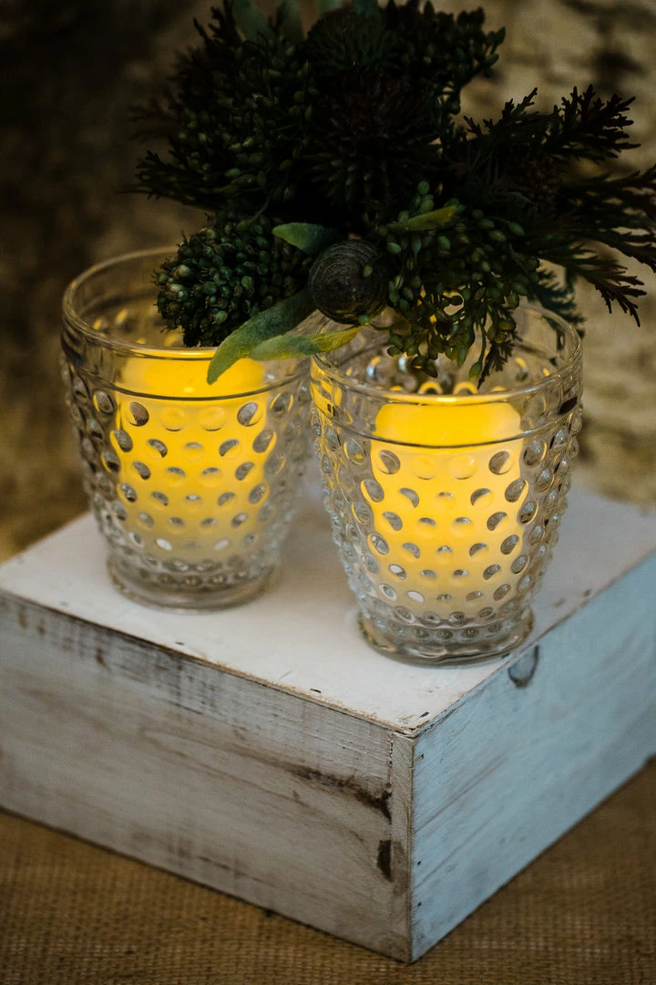 Darling Dottie! This amazing thick, textured glass holder makes a statement. Larger than a votive holder, Dottie fills up any space where placed beautifully. The base leads to the dotted raised textured design up to the clear top rim completing the look. Whether you use a votive candle, led votive candle, floating candle, or fill with your favorite blooms Dottie will not disappoint! The glimmering glow thru the textured dots is simply perfect. Weddings, events and homes will love you for incorporating the Dottie holder in your design!