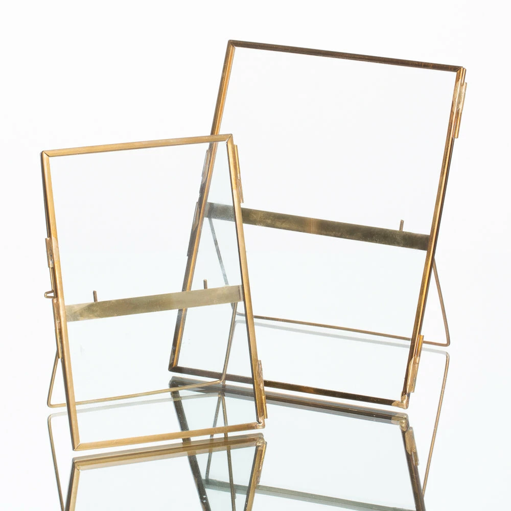 Frames hold treasures! Our Richland glass photo frames are the perfect spot to place your special memories. With two pieces of glass to press pictures, flowers, or other keepsakes, our frames fit the bill. This frame boasts a perfect stand that makes for easy placement. The beautiful dusted gold metal frame adds to the finished look. Perfect for home and event! Mix and match with our other Richland frames to create your own beautiful space. Set includes one of each size frame.