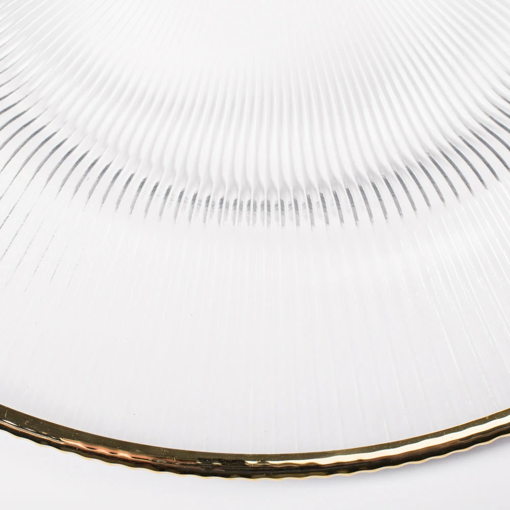 This fabulous addition to our charger plate category is our all glass gold rim charger plates! These thick, high quality plates are simply stunning and add the perfect touch to your table. This textured clear glass plate with gold painted trim is a perfect choice for those that might not want to use a traditional charger plate; but still need the sophisticated look. A great choice for weddings, parties, and other special events!Â