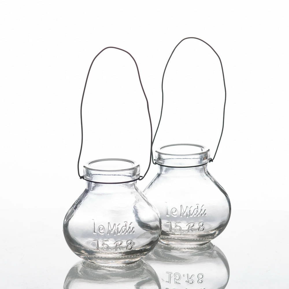 A perfect hanging mini vase! This clear glass holder with simple raised etched text provides the perfect vintage flair. The black bendable wire allows this vase to be hung anywhere you’d like! The text on the jar reads: Le Mídí 15.R8